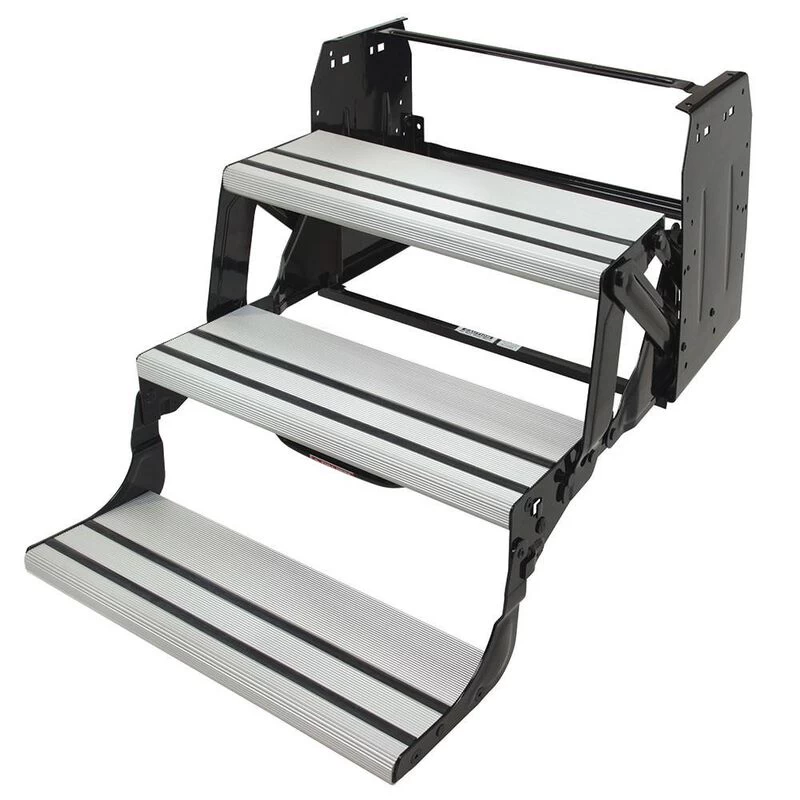 Features strong, proven steel linkage and aluminum treads with anti-slip rubber grooves for excellent traction. Lightweight aluminum step treads resist rust, ensuring long-lasting durability. The Alumi-Tread Step® is available in triple and quad configurations, lending a clean, modern appearance to your RV and consistent, smooth operation at an attractive price.