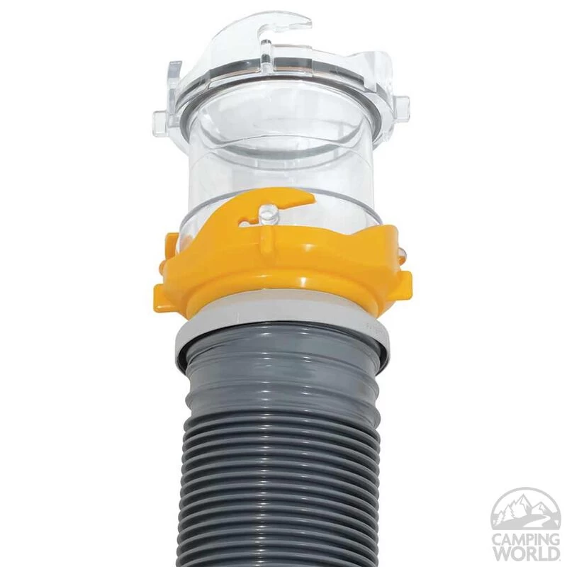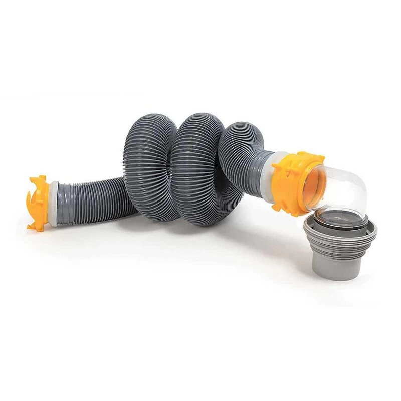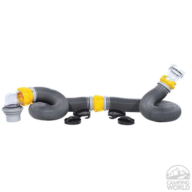 Super Heavy Duty hose is 20% thicker than standard hoses. Two 10′ hoses feature 360 degree pre-attached swivel fittings. Use 1 or both hoses with included clear elbow, 4-in-1 adapter, bonus clear extender and 4 storage caps. Made in USA.