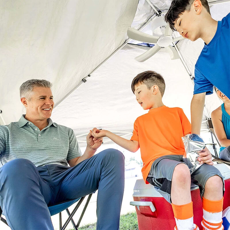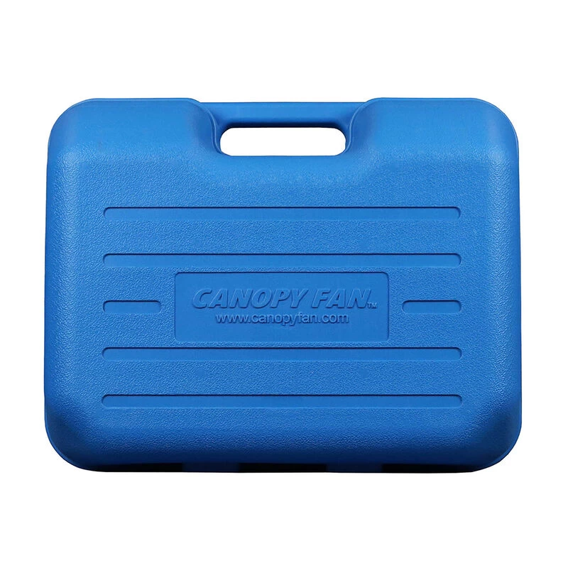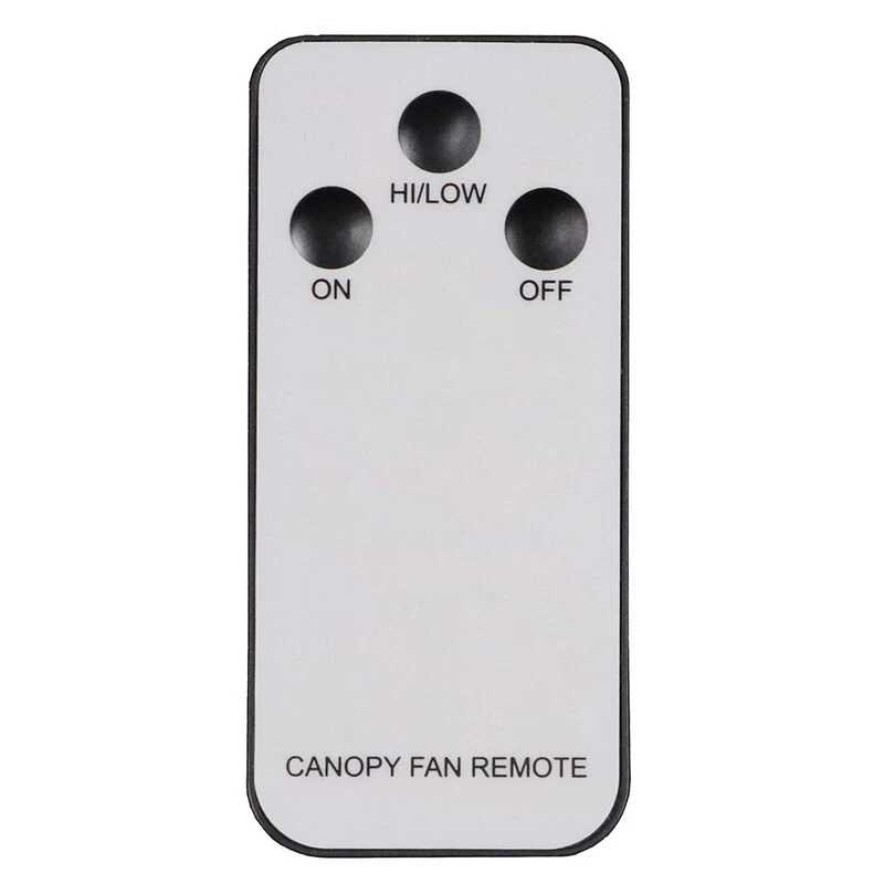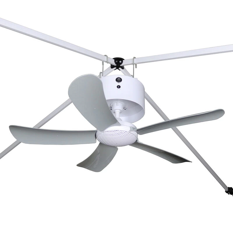 Ideal for use when wind is below 10 mph, the fan has four hooks that attach to the frame of most 10’ and 12’ canopies where roof joists are perpendicular at their apex (“X” shape). It also has a hoop at the top that allows one to suspend the fan from a single hook, making it compatible with pergolas, gazebos, workshops, etc.