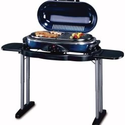 The Coleman RoadTrip Classic Grill is perfect for tailgating or entertaining at your campsite. Use the grill on the folding stand or detach it for use on a tabletop. Fast and easy to set up and use, this powerful propane grill boasts authentic, open-flame, drip-through grilling and 20,000 BTUs of total cooking power. The RoadTrip Classic Grill features a die-cast aluminum cooking grate and griddle; two fully adjustable, independently controlled stainless-steel burners; a removable grease drip pan; and Instastart matchless ignition at the push of a button. The lid detaches to accommodate large pots and pans and locks securely during transportation. The fold-out side tables offer convenient space for placing utensils or loading up your serving plates. The grill operates using a 16.4-oz. propane cylinder or a 20-lb. tank with adapter hose (all sold separately). 285 sq. in. cooking area. Dimensions: 50″L x 19″W x 36″H. Weight: 41 lbs. Five-year limited warranty.