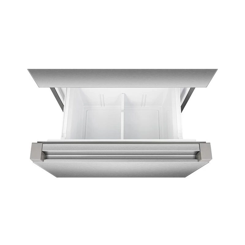 - Adjustable glass shelving and full-width pantry drawer for organizing groceries