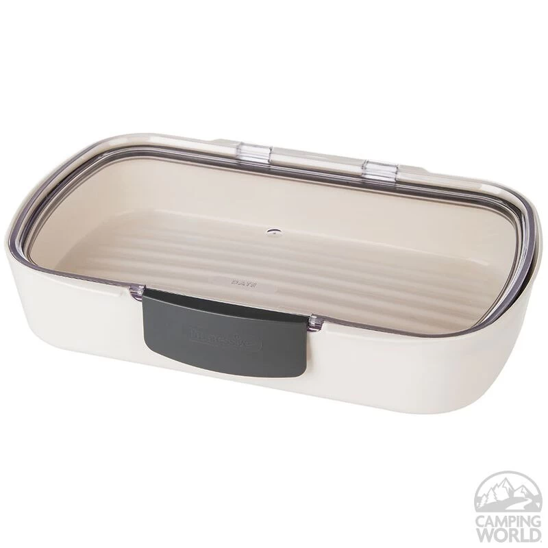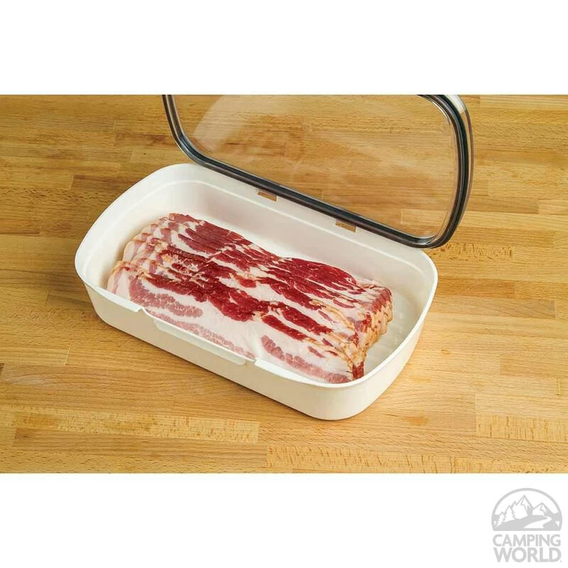 Silicone seal keeps meats, cheeses and even a pound of sliced bacon fresher in your refrigerator. Custom grooves in the bottom catch excess juices. Hinged lid flips back to fit in dishwasher. Dishwasher safe.
