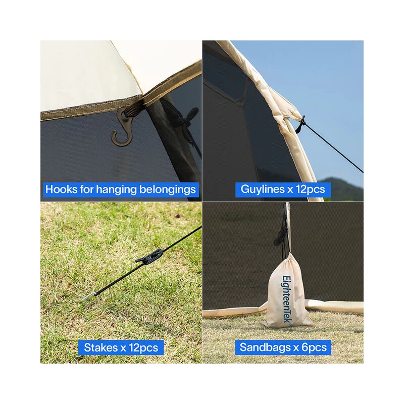Accessories: 6 elongated sandbags, 12 guylines, 12 mounting stakes