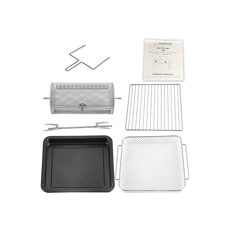 - Includes air fry basket, wire rack, baking tray, rotisserie cage, drip tray, and more