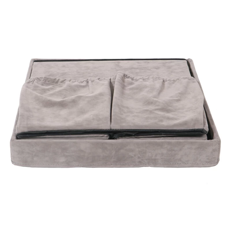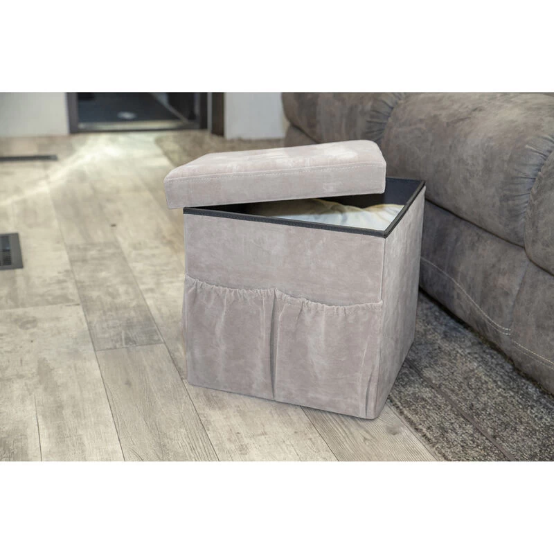 This folding ottoman is great for RV travel. Fold it up for compact storage, then pull it out on the RV patio for a relaxing evening. Made of MDF board with interior polyester lining and suede shell material. 14.75″L x 14.75″W x 14.5″H.