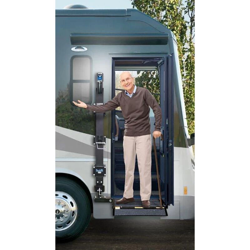 This new personal platform lift from Burr Engineering will raiseyou from ground level to the entrance of your RV safely and at acontrolled speed. It eliminates the struggles, apprehension, andphysical exertion that you may have experienced in the past justto gain entrance to your vehicle.