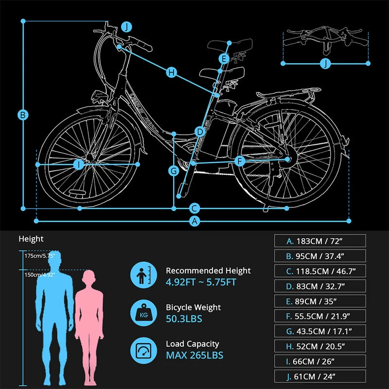 This men’s and women’s bike has a 36V 8.0Ah lithium battery attached to its frame. This removable battery can reach a range of up to 22-25 miles per charge. The entire E-bike is made of high-quality aluminum alloy. The tire frame is lightweight and easy to maneuver, yet solid and durable.