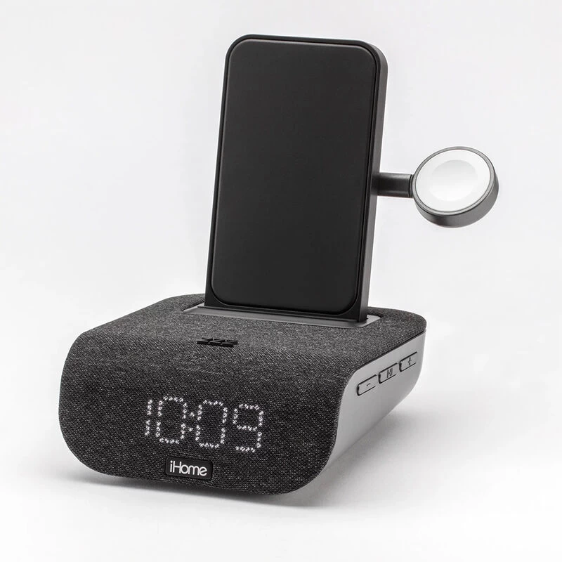 - Integrates an Apple Watch charging arm into a sleek, space-saving Bluetooth alarm clock
