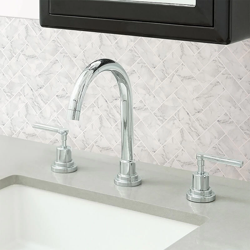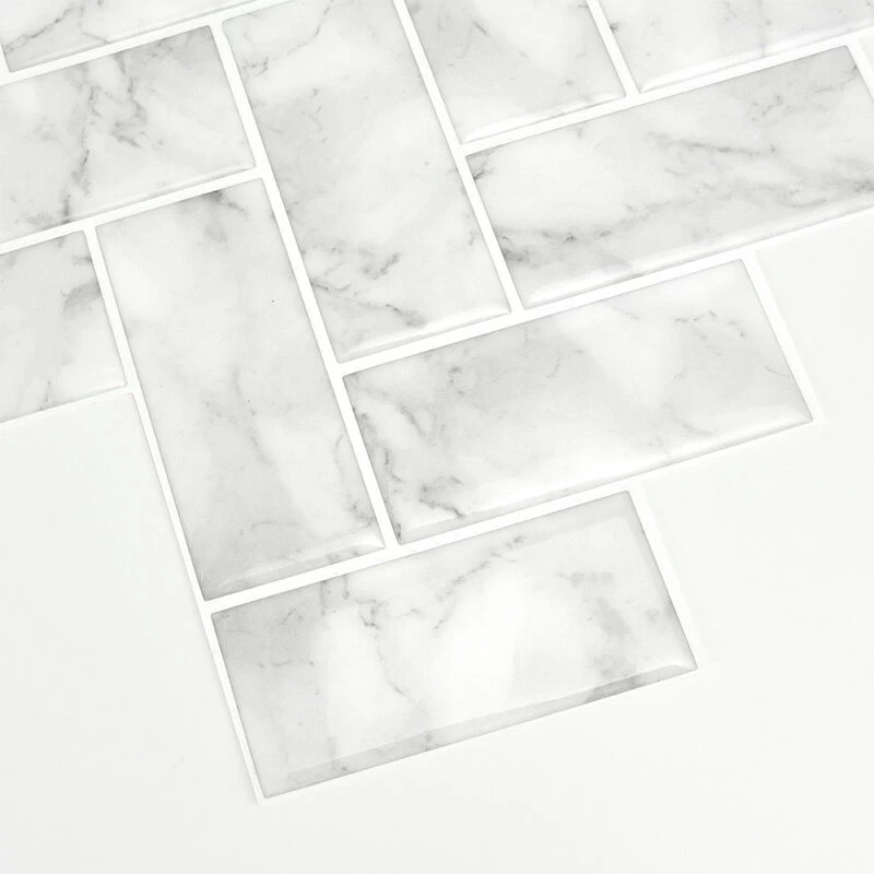 - White marble inspired tiles in a beautiful herringbone pattern