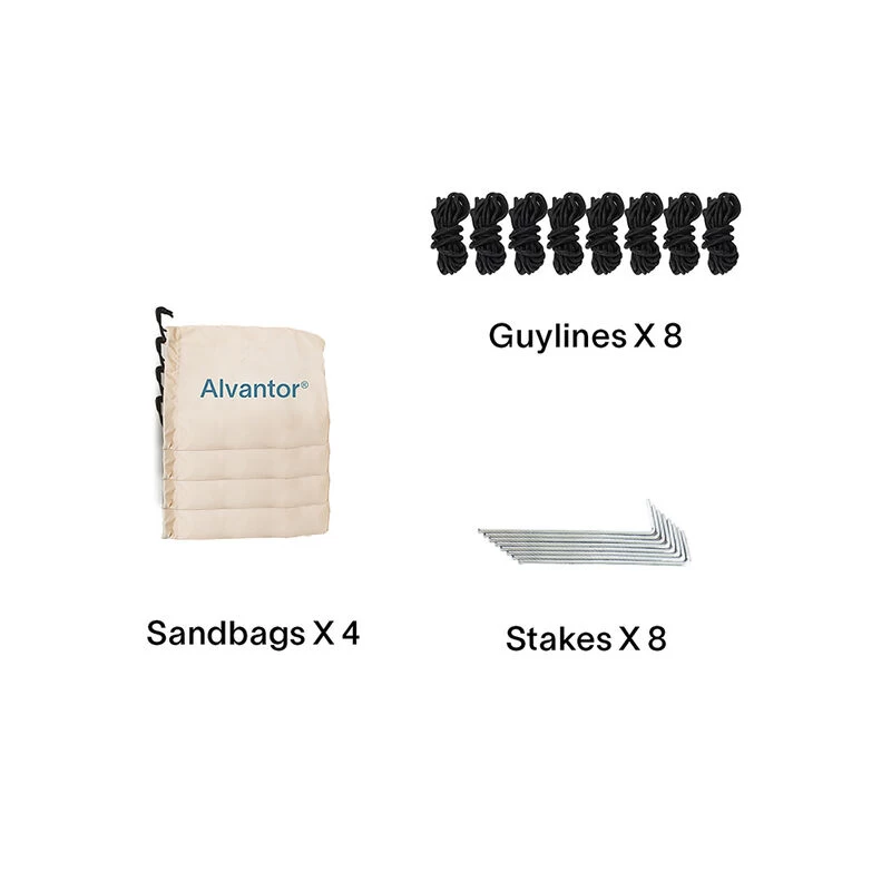 Accessories: 4 elongated sandbags, 8 guylines, 8 mounting stakes