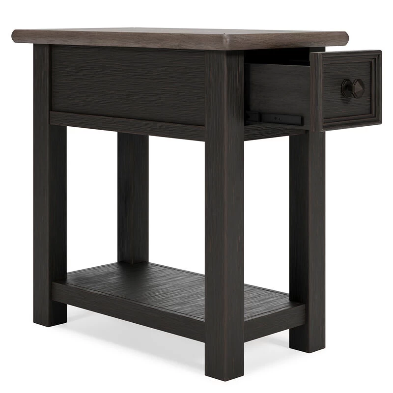Quality crafted and richly styled, this rectangular chairside end table is sure to charm. Two-tone aesthetic pairs a weathered grayish brown tabletop with a textured wire brushed base in black with rub-through effect. Built-in shelf offers handy display space. Integrated 110V power supply with dual USB charging ports makes it so easy to your personal devices powered up.