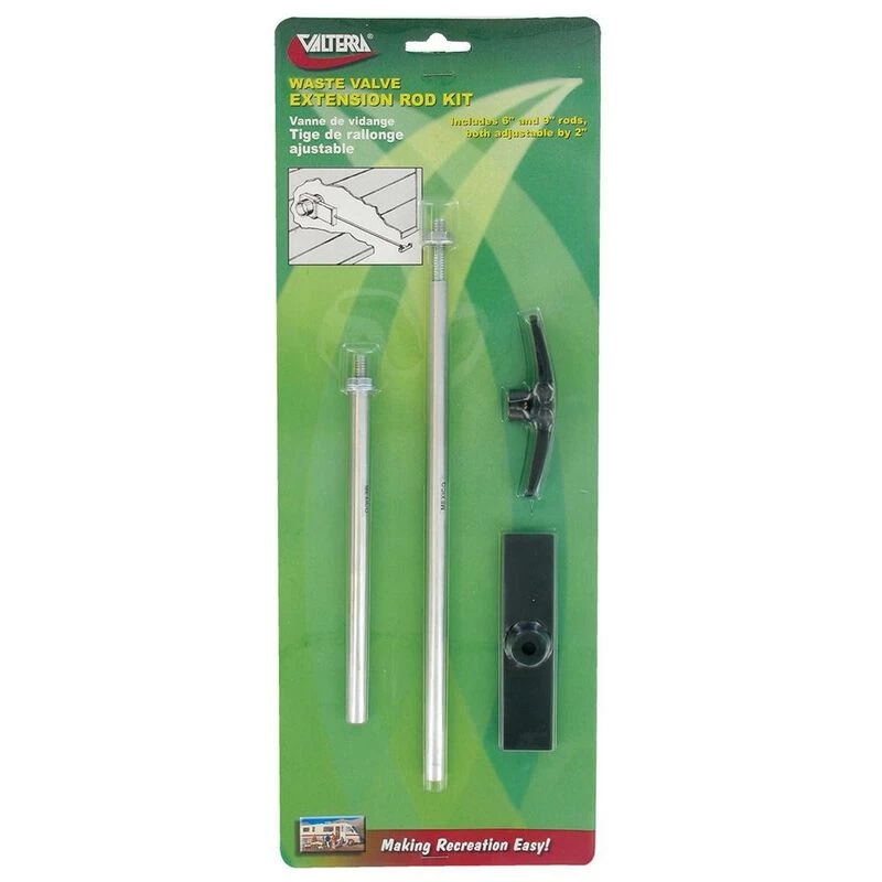 Valterra’s waste valve extension rod kit makes reaching your RV sewer valve handle easier and more convenient and eliminates the need to get down on your knees to open or close the valve. Kit includes the two most common sized extensions (6″ and 9″). Aluminum extension rod adjusts up to 2″. Handle attaches to threaded stud. Mounting bracket included.
